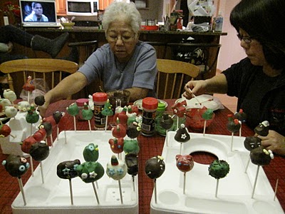 If you read my personal blog, you’ll know that I heart Bakerella and I actually got to meet here when she came to Toronto on her book tour. I had tried unsuccessfully to make cake pops once, but this time I decided to take advantage of my Christmas holidays and some help with the family. I bought a ton of candy melts from Michael’s and some lollipop sticks and took my book home for inspiration.