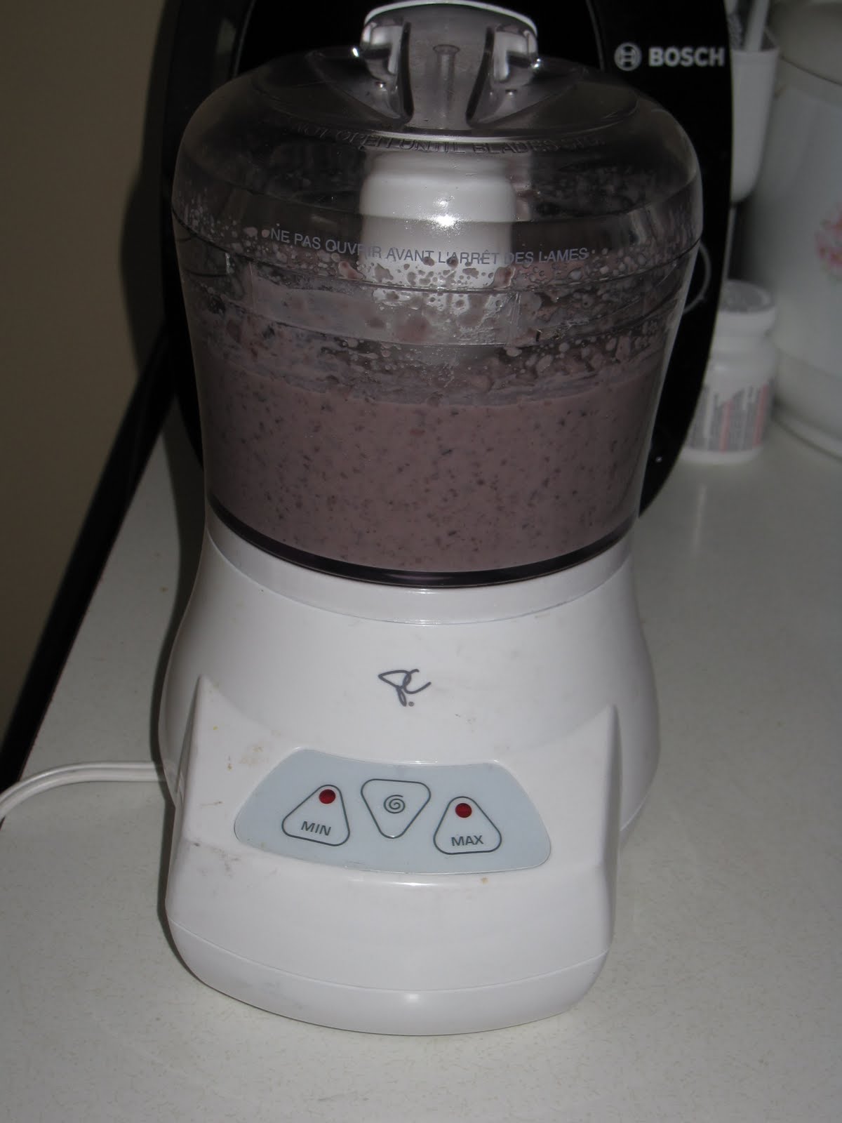 So I found a can of black beans in the cupboard (I’m a big chili fan, so we always have beans in the cupboard, fresh or canned), rinsed them off and pureed them with a little bit of water in my undusted, unused and otherwise ignored food processor.