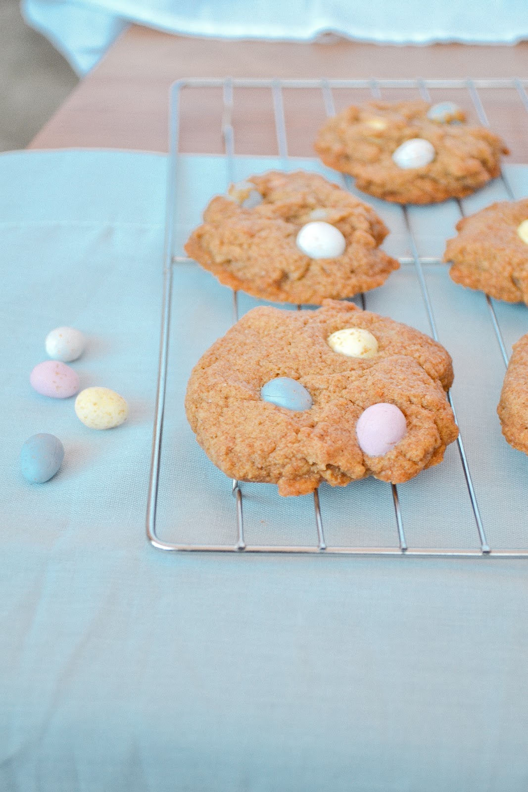 - Drop mounds approximately 1 1/2 tbsp in size on a greased baking sheet. Slightly flatten the dough to ensure the cookie will be cooked evenly. To make mini eggs more visible in the cookies, this would be the time to squish a few into the unbaked cookies before sticking them in the oven