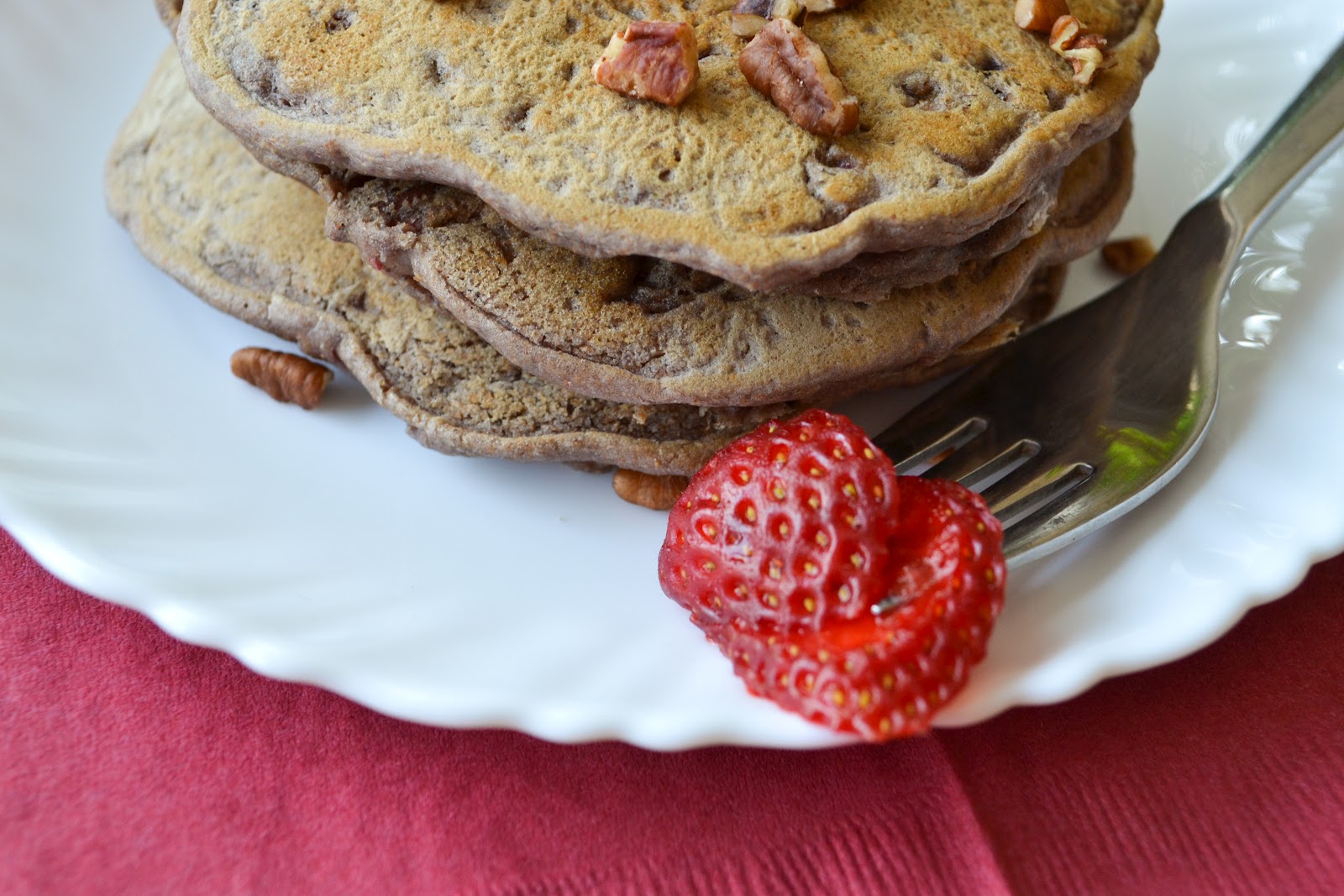 All of which I totally did when I made these. These strawberry pecan pancakes satisfied me in a way that only weekend breakfast (and sleeping in) can. Moist and sweet from the strawberries and filled to the brim with nutty and wholesome pecans. Trevor even enjoyed his helping because they were dairy-free. Plus he didn’t have to tip anyone!