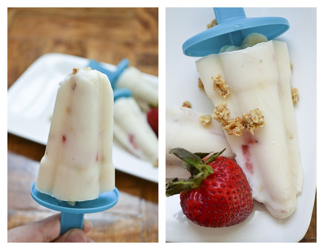- In a large bowl, combine the container of yogurt with the strawberries and granola. Carefully spoon into popsicle molds, tapping softly on a hard surface to get rid of air bubbles.