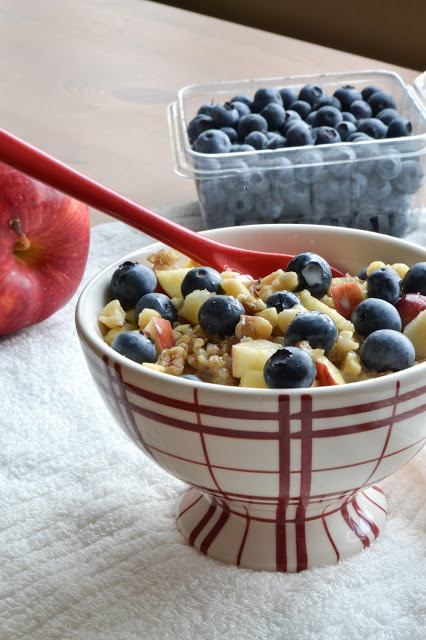 - Spoon quinoa into four bowls and drizzle with maple syrup. Sprinkle diced apple, blueberries and walnuts and add warm milk.