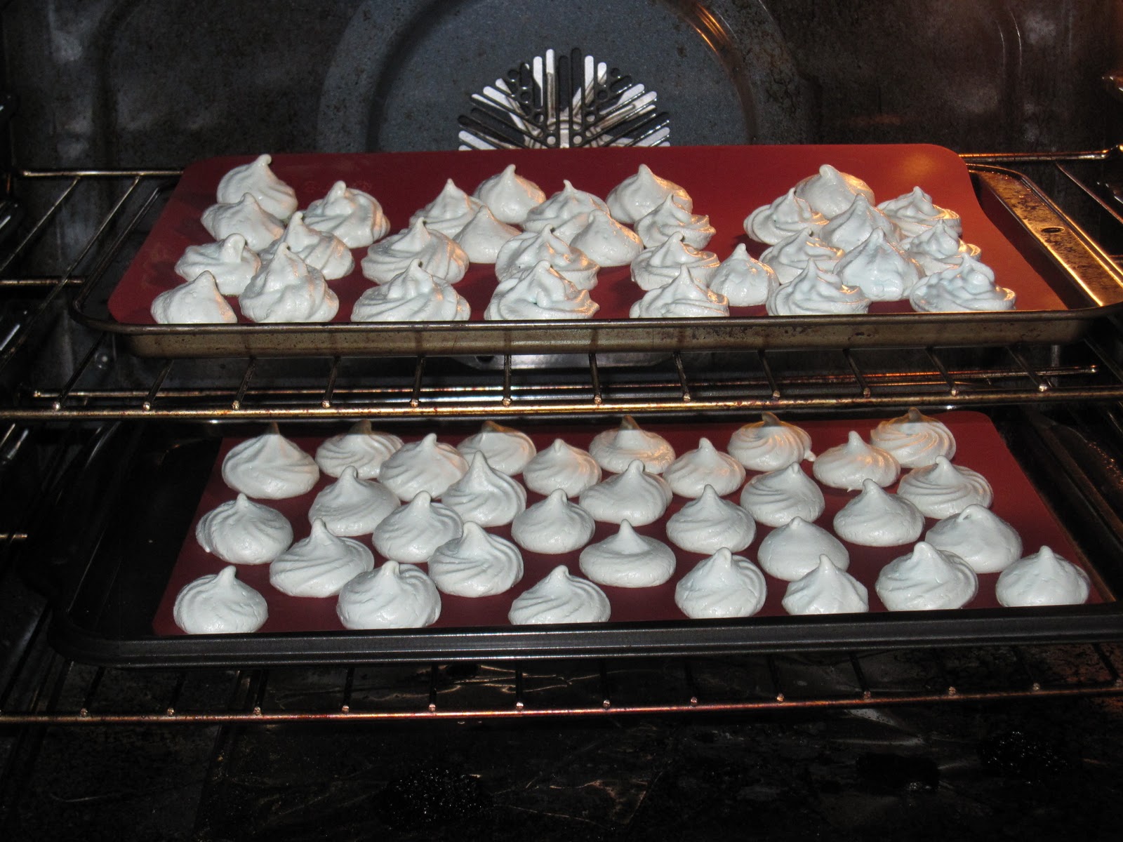 Nathan used my Mom’s Pampered Chef Easy Accent Decorator, which has a pump to squeeze out the icing in perfect little swirled circles. He thought he was so clever, but what fun is baking if you can’t get elbow deep in sticky meringue batter? (I’m still at the learning stages with grasping with the icing piping bag).